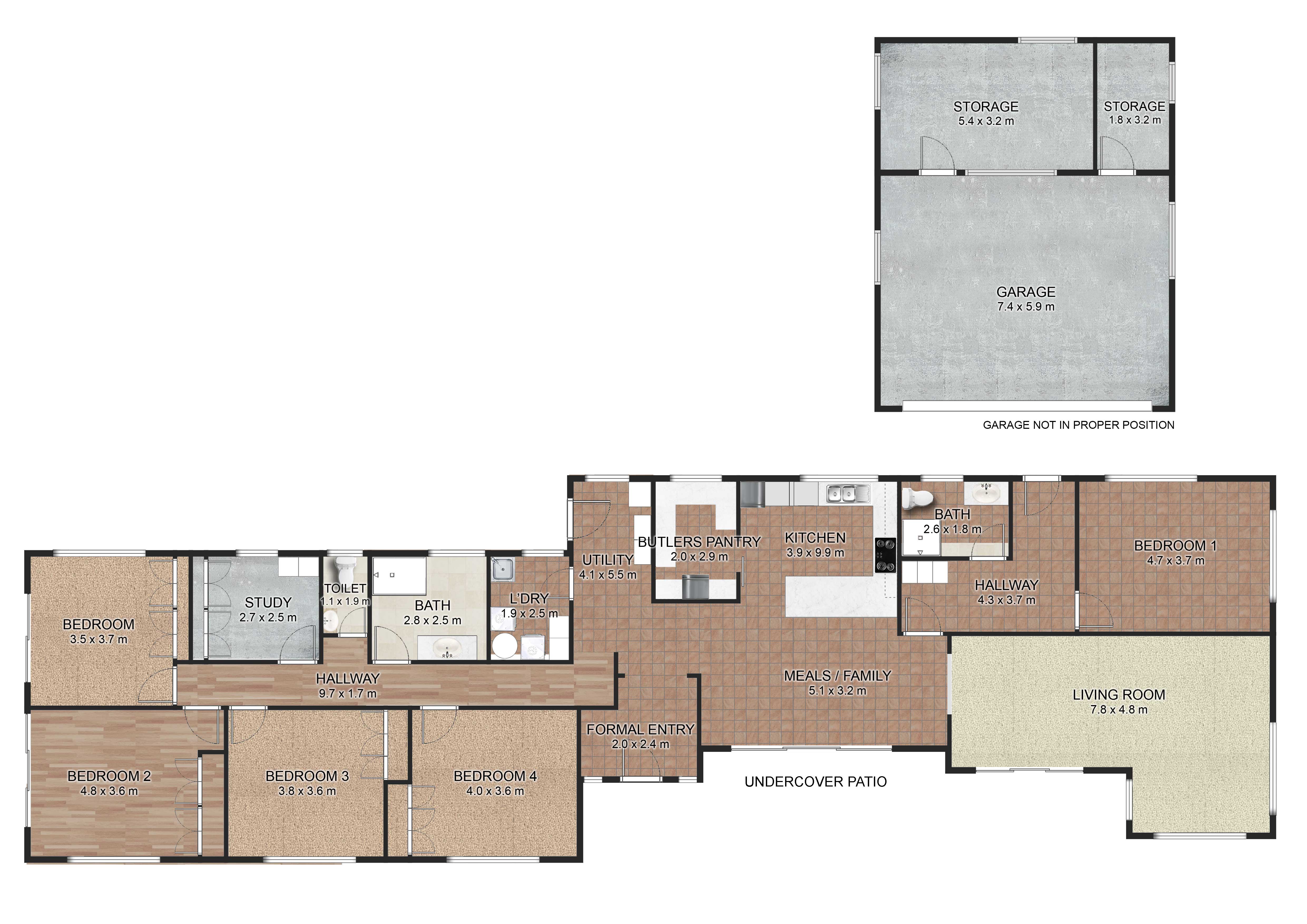This property is a blank canvas ready for renovation and the floor plan inside is spacious with separate formal lounge and dining, meals area, formal entry, kitchen with walk in pantry, main bedroom with possible conversion to a granny flat with its own bathroom and entrance at one end of the property, and in the other end of the house are 4 other bedrooms and study.